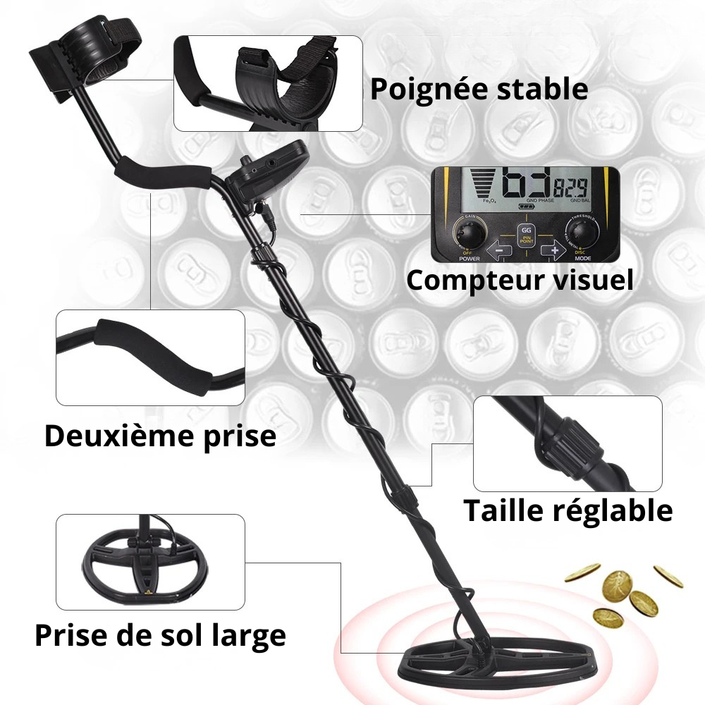 L’appareil est équipé d’un écran LCD permettant l’affichage des informations de détection, ainsi que de signaux sonores pour faciliter l’identification des cibles. Sa bobine DD étanche de 11 pouces est conçue pour une utilisation sur différents types de terrains, y compris sols secs, sable, zones humides ou terrains minéralisés.
